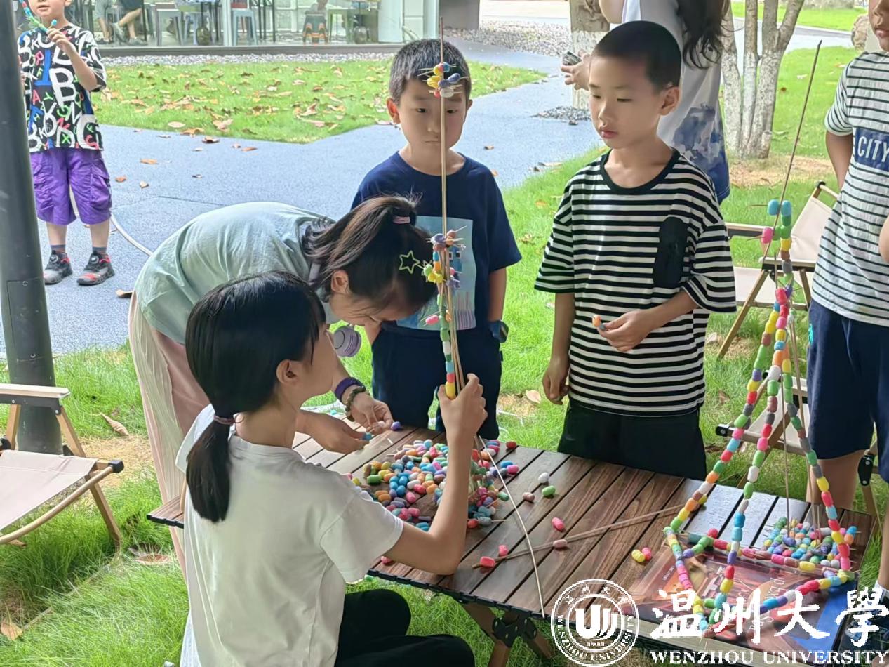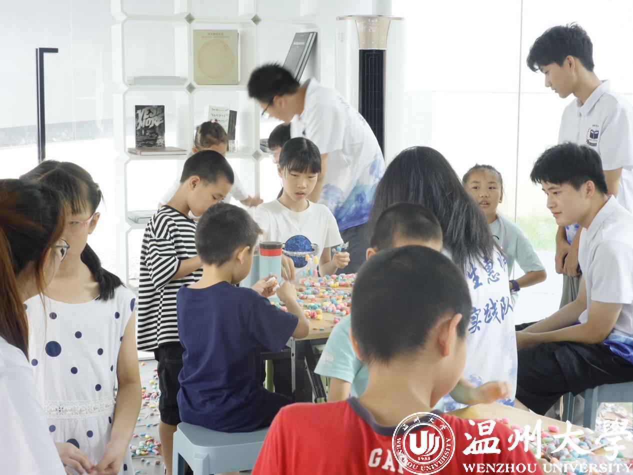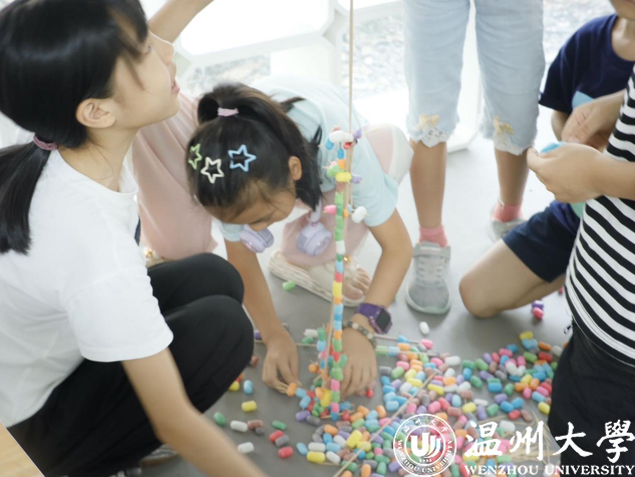 在太阳集团榕亭书屋,太阳集团暑期实践队和小朋友们一起开展了一堂“温大第一高楼”建设大比拼。活动利用牙签、木棍与彩色泡沫球搭接,进行“建设大比拼”,对比各组的搭建高度。