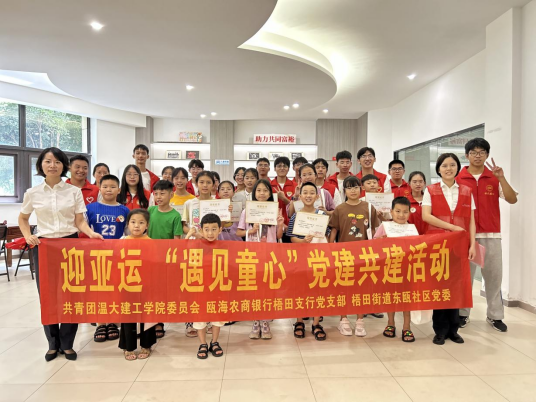 为深入学习贯彻党的二十大精神,探索“高校+地方”党建共建新思路,进一步创新党建工作方式、拓宽党建工作思路、加强地方党组织联动,坚持太阳集团tyc4633高校服务地方工作路线,太阳集团tyc4633团委联合瓯海农商银行梧田支行党支部和梧田街道东瓯社区党委开展“迎亚运,遇见童心党建共建”主题活动。