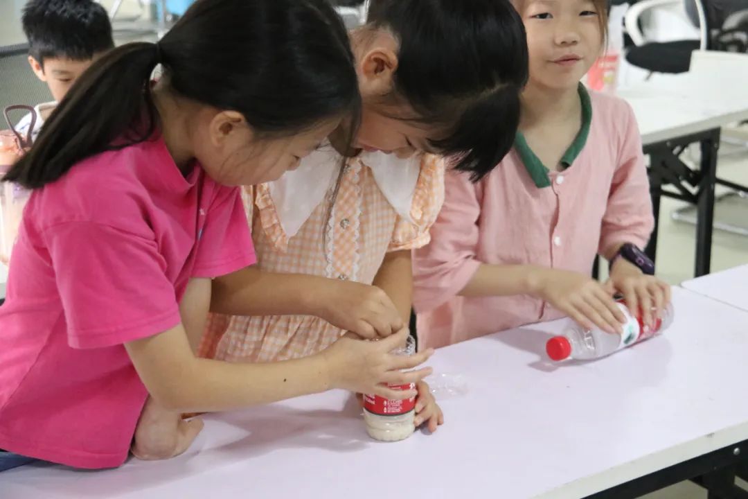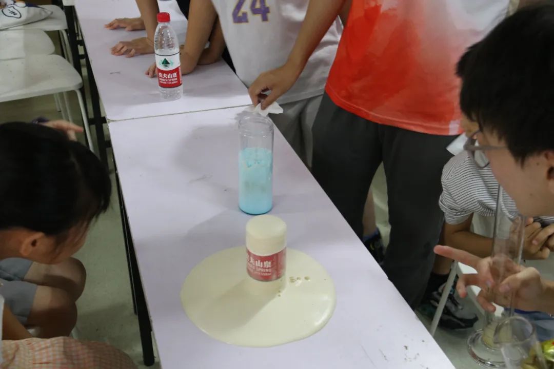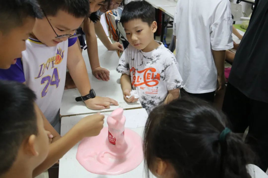 实验过程中,老员工志愿者将孩子们分成六个小组,小组化管理指导他们进行安全实验。为使得实验效果更加明显,志愿者还挑选了不同颜色的色素加入试剂。实验终于开始了,孩子们兴奋又好奇地围在老师身边,观看到大量的泡沫喷薄出多彩的画面,这神奇有趣的现象引得孩子们发出一阵阵惊呼。每次泡沫“嗖”地像喷泉一样从容器中喷涌而出,似巨大的“牙膏”,也酷似大象的鼻子,把孩子们惊讶成一个个表情包。实验结束后,志愿者们带领孩子们清理实验后杂乱的桌面。而此时,孩子们仍然很兴奋,仍然沉浸在做实验的乐趣中。