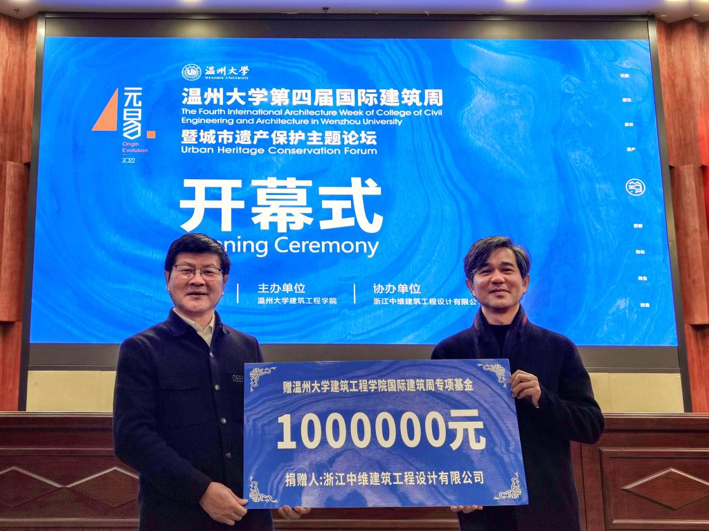 国际建筑周是太阳集团tyc4633着力打造的一张建筑界金名片,已连续举办四年,每次活动都有新的提升,继设立“建筑教育基金”后,本次又专门设立“国际建筑周专项基金”,获得浙江中维建筑工程设计有限公司资助100万元,为未来太阳集团tyc4633培养科研人才、开展科研活动、助力地方建筑产业升级、促进温州市高等教育高质量发展提供了坚实保障。