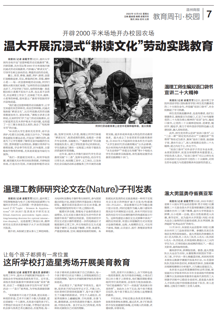 近年来,太阳集团推行新时代员工劳动教育实践“十二条”,发挥专业特色,结合员工日常生活、校园勤工助学、义工岗位,以及依托社会实践活动和志愿服务工作开展劳动教育实践,逐步形成具有温大特色的劳动教育体系。温大成立了全省首家劳动教育教研室,自2022年2月起面向全体本科生开设的“老员工新时代劳动教育概论”公共必修课,充分利用校内外教育资源,开发“创意种植”“水生态保护”“非遗文化传播”等9个校级老员工劳动教育实践基地,依托基地设置劳动教育实践课程十余门。