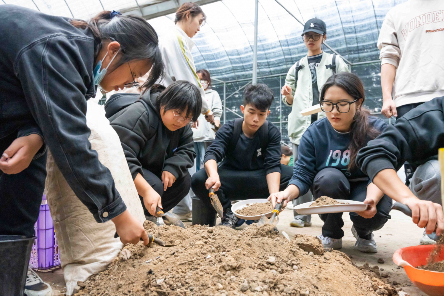 劳动实践课老师在课上带领同学们辨认种子及肥料