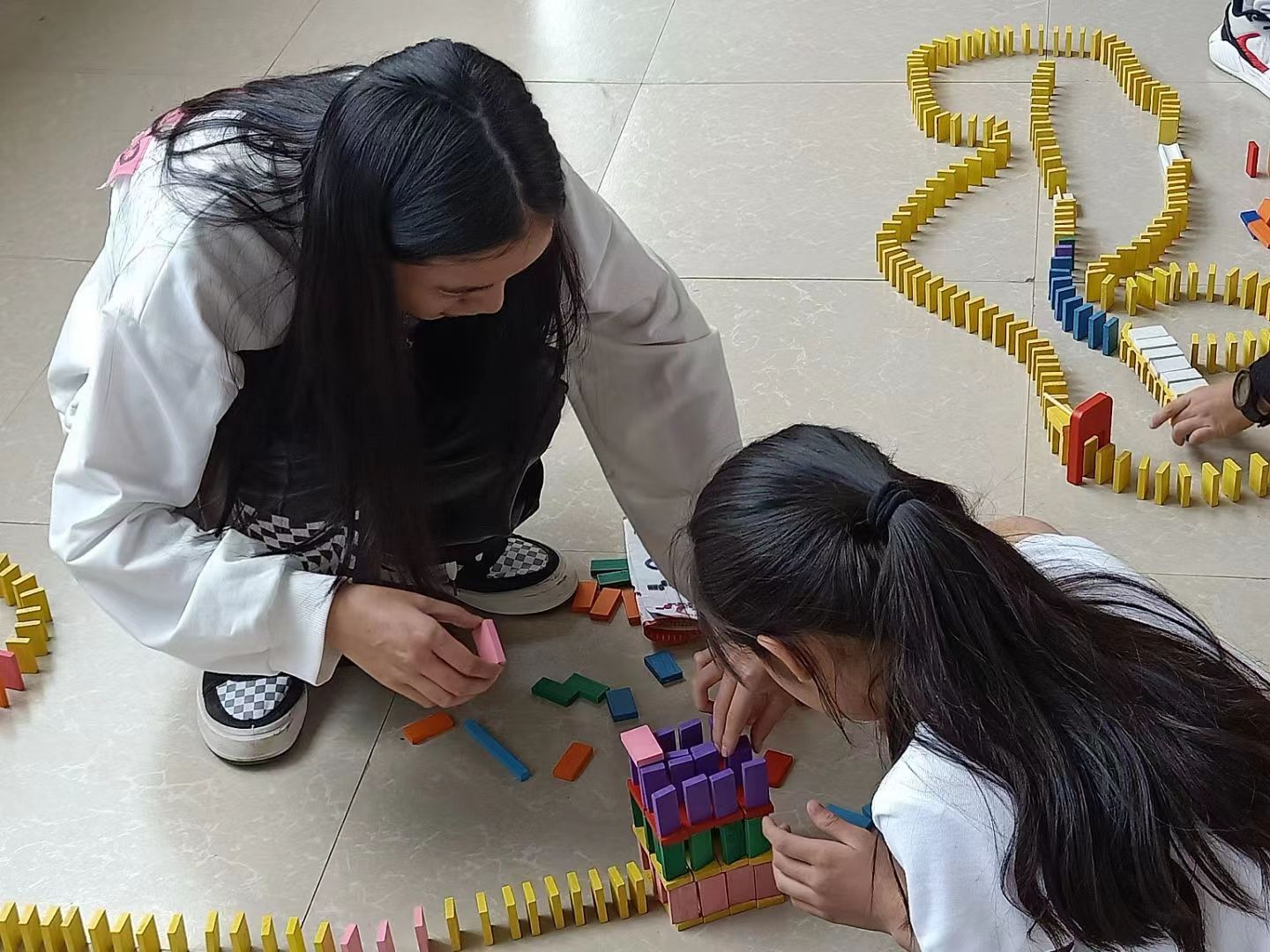 “123开始!”,小朋友手指一动,刷的一声多米诺骨牌应声倒下,课堂上又传来的一阵欢声笑语,课堂上,老师和员工们早已打成一片。这项具有太阳集团tyc4633的专业特色的公益课堂已经坚持了十年。