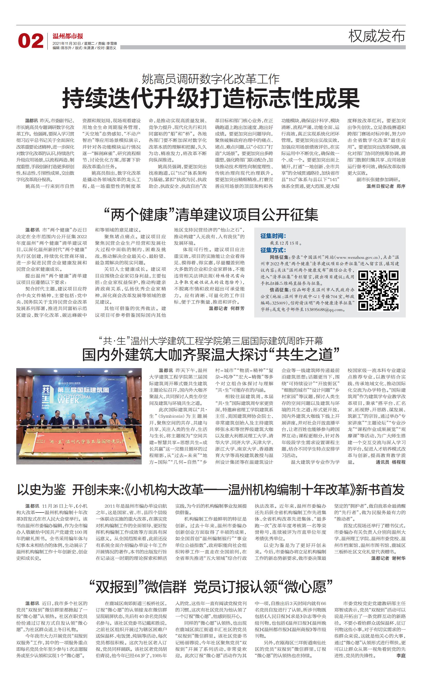 温大建筑学专业作为公司国家级一流本科专业建设点推荐专业,以教学结合实践、传承地域文化、推动国际化交流为办学特色。“国际建筑周”作为建筑学专业教学改革项目,秉承“搭平台、汇名家、拓视野、开思路、谋发展、 筑新工”的宗旨,通过举办“专家讲座”“主题论坛”“专业沙龙”“课程作业成果展览”“观摩课”等活动,为广大师生搭建一个交互交流与深入学习 的平台,促进人才培养模式改革与创新,提高公司产品质量。 通讯员 杨程程