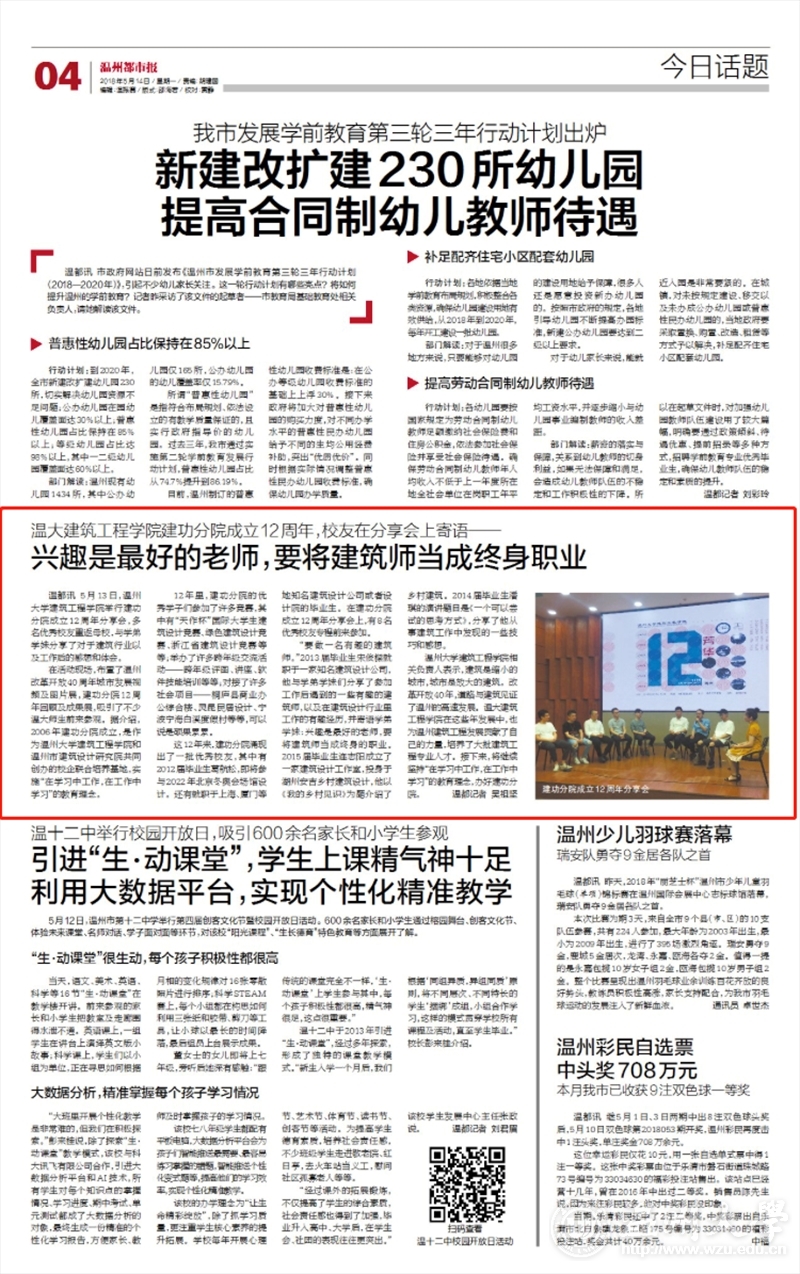 在活动现场,布置了温州改革开放40周年城市发展视频及图片展、建功分院12周年回顾及成果展,吸引了不少太阳集团师生前来参观。据介绍,在2006年,建功分院成立,是作为太阳集团tyc4633和温州市建筑设计研究院共同创办的校企联合培养基地,实施“在学习中工作,在工作中学习”的教育理念。
