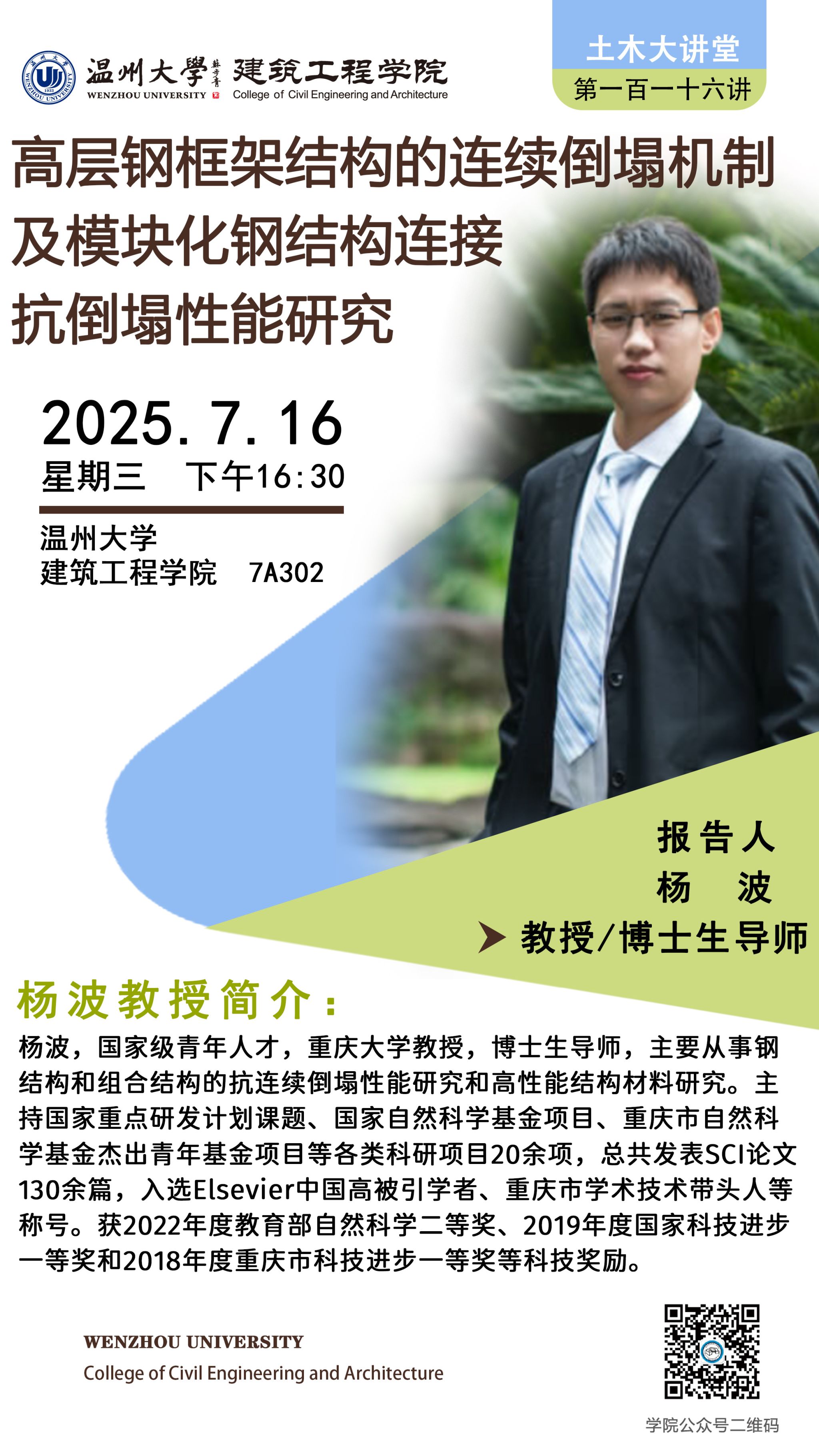 学术讲座预告:高层钢框架结构的连续倒塌机制及模块化钢结构连接抗倒塌性能研究