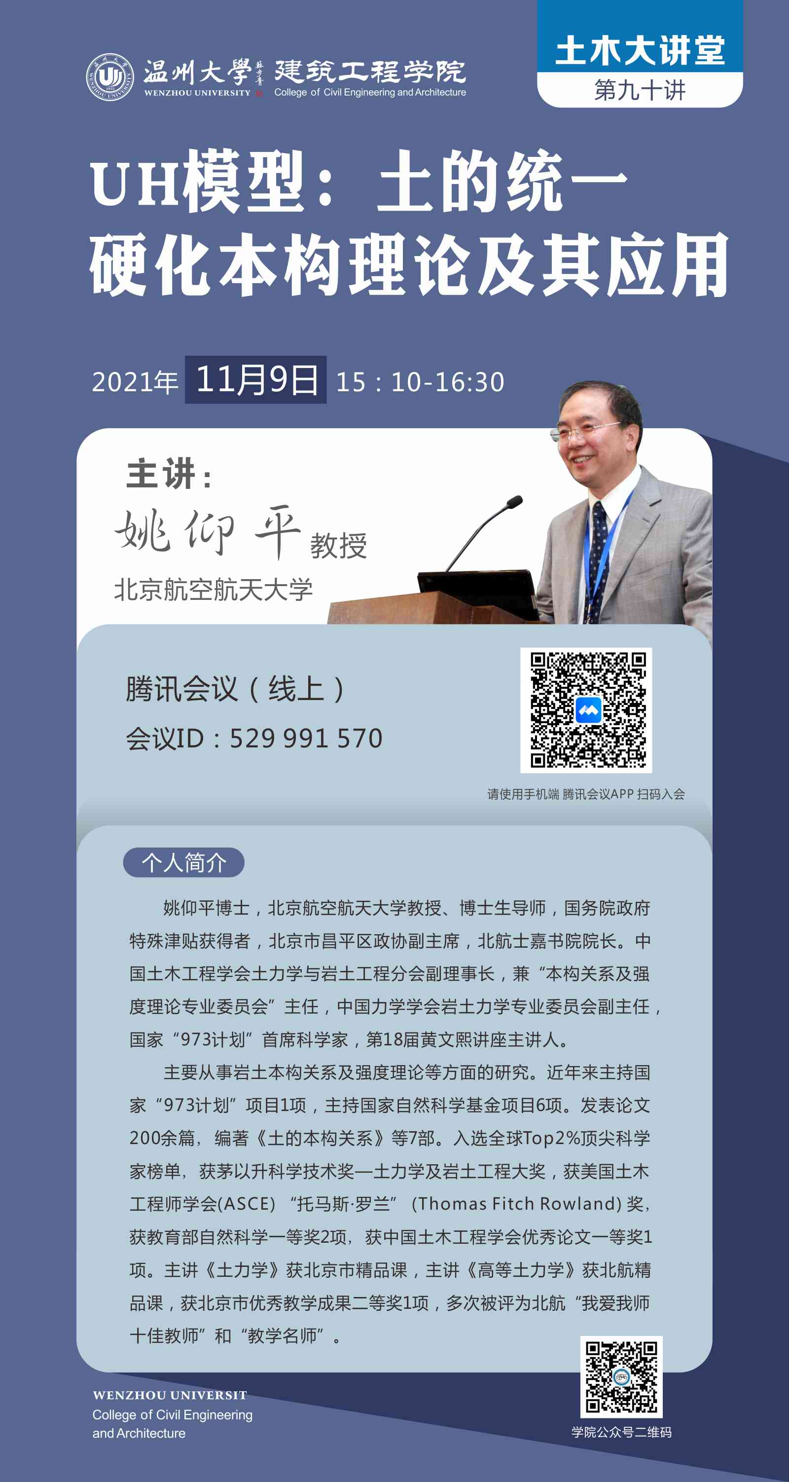 学术讲座预告:UH模型:土的统一硬化本构理论及其应用