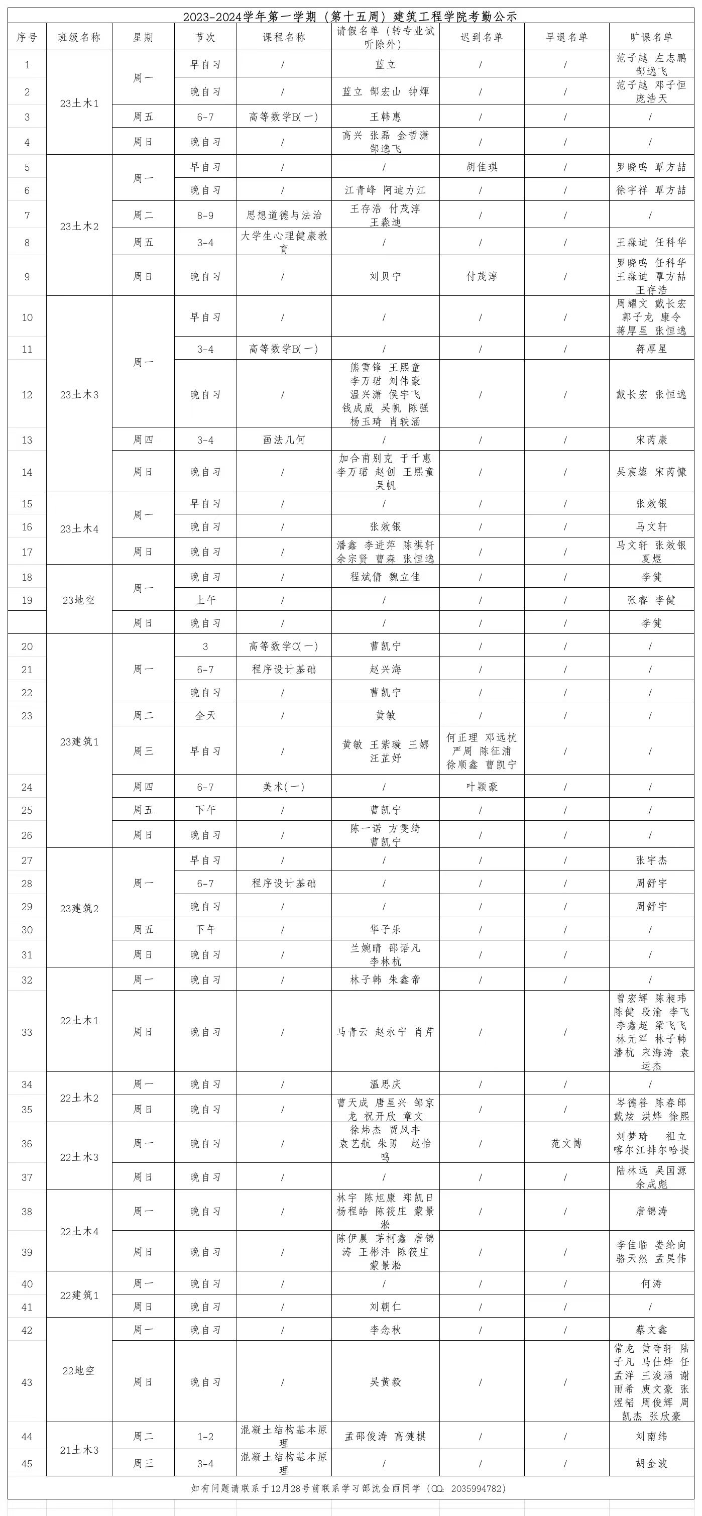 2023-2024学年第一学期(第十五周)太阳集团tyc4633考勤公示
