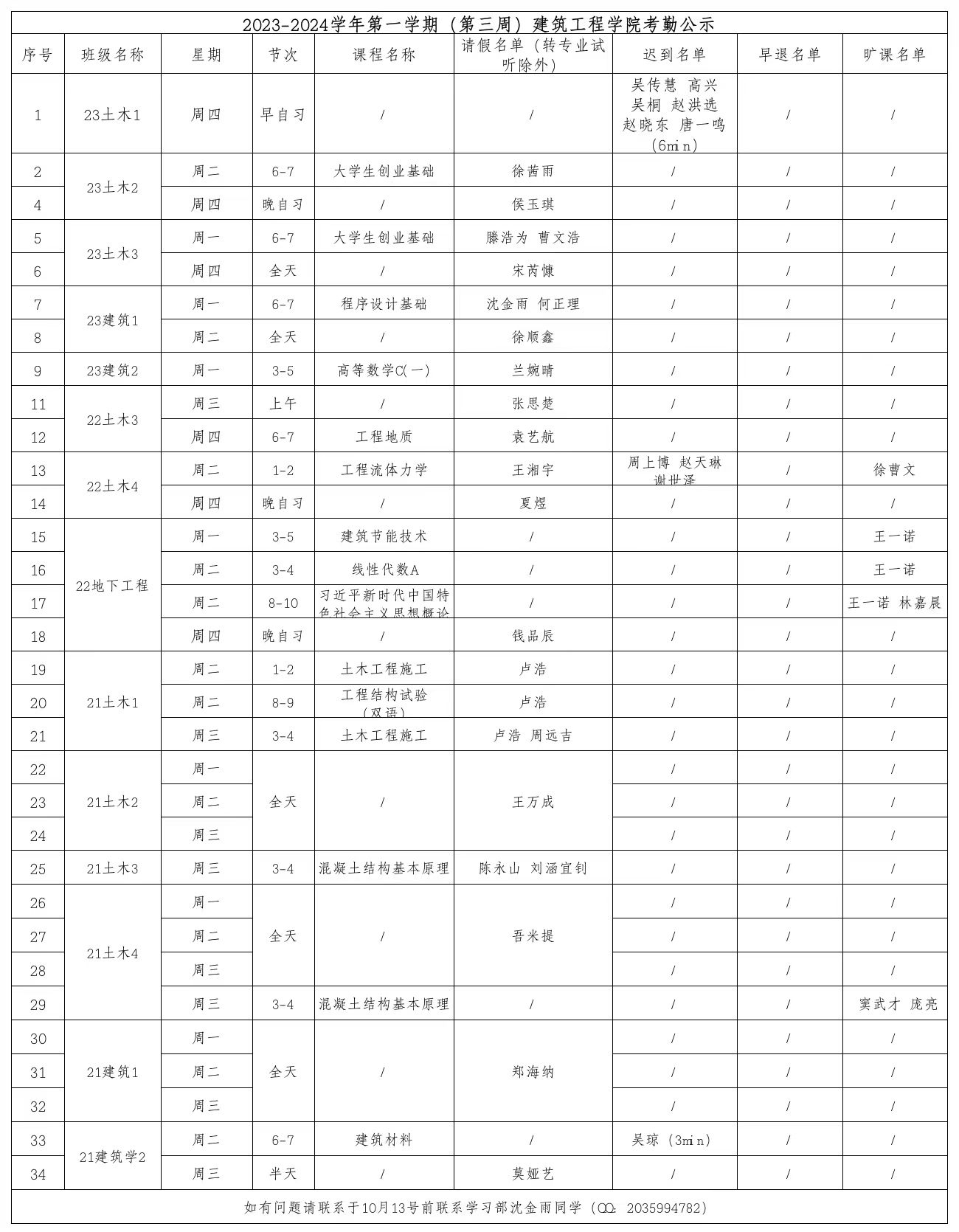 2023-2024学年第一学期(第三周)太阳集团tyc4633考勤公示