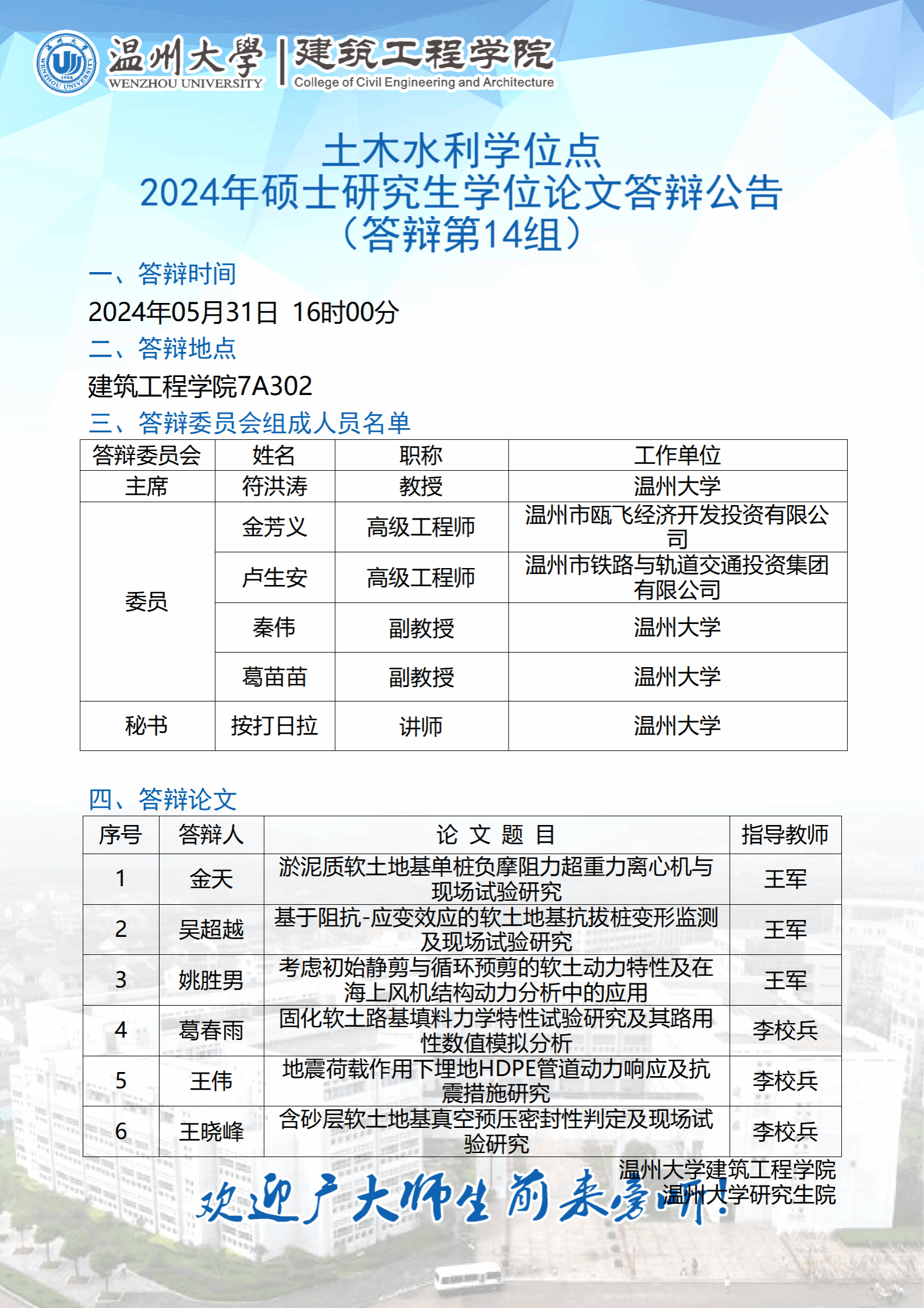 太阳集团tyc4633土木水利学位点2021级硕士研究生学位论文答辩公告(四)
