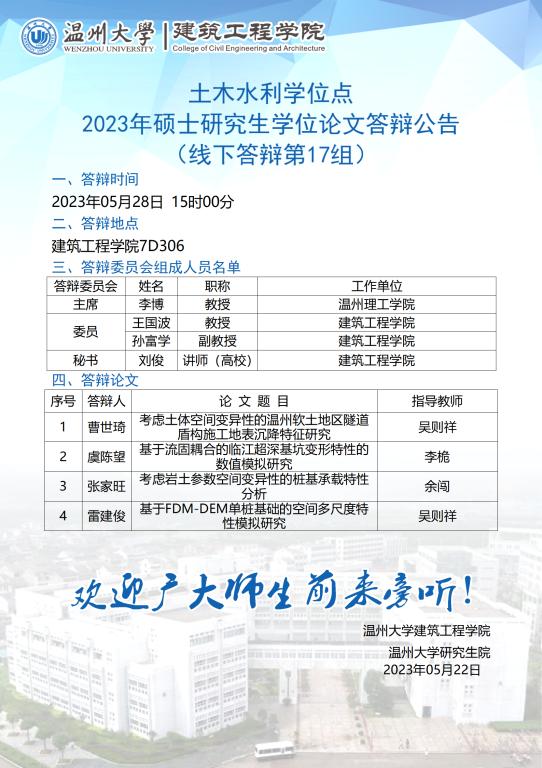太阳集团tyc4633土木水利学位点2020级硕士研究生学位论文答辩公告(四)