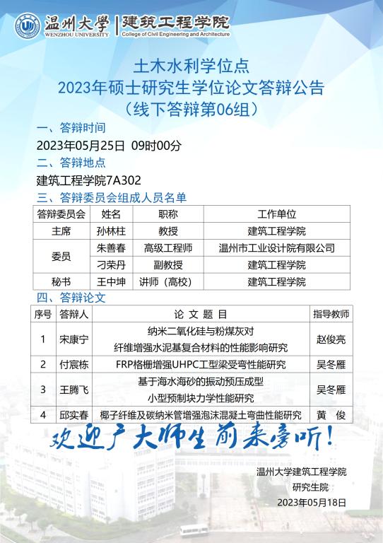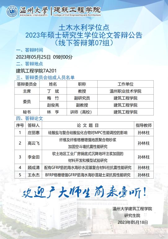 太阳集团tyc4633土木水利学位点2020级硕士研究生学位论文答辩公告(二)
