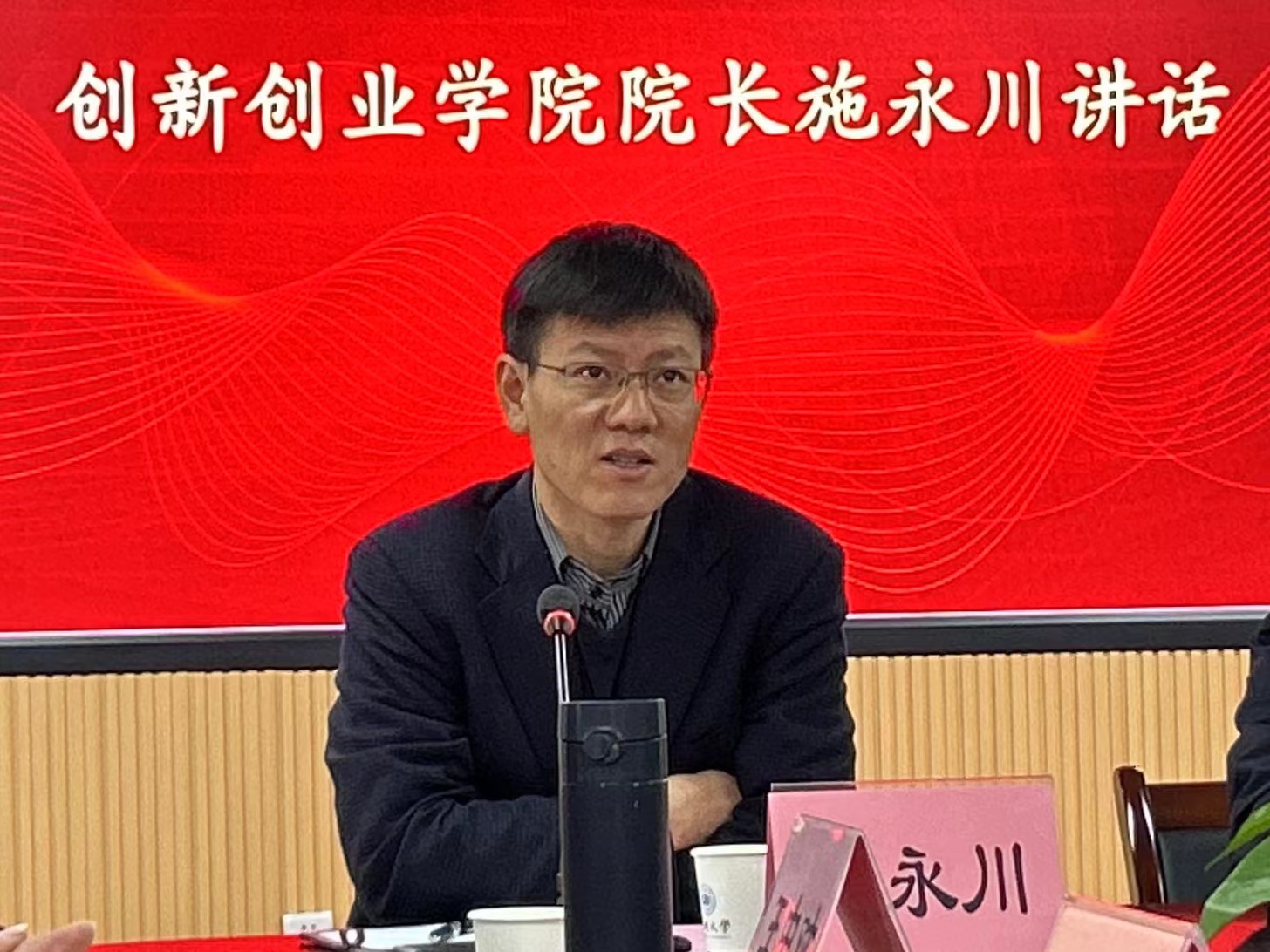 创新创业公司经理施永川讲话。他提出三点希望,一是要努力成为“复合型”人才;二是要脚踏实地,更要仰望星空;三是要注重自身能力培养。在实践中成长,不断充实自我、学有所得、学以致用。