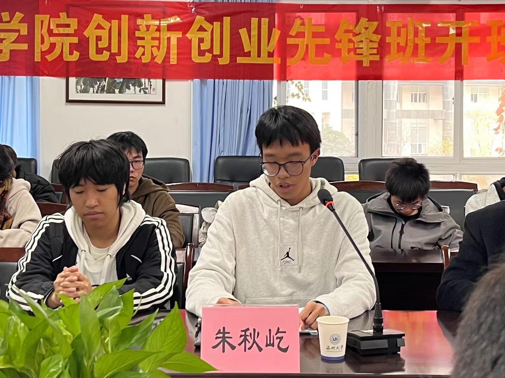 “创新创业先锋班”副班主任刘臣玉介绍项目培育实施方案。主要包括“互联网+”竞赛政策与文本写作技巧、“挑战杯”竞赛政策与文本写作技巧等六项主要安排。