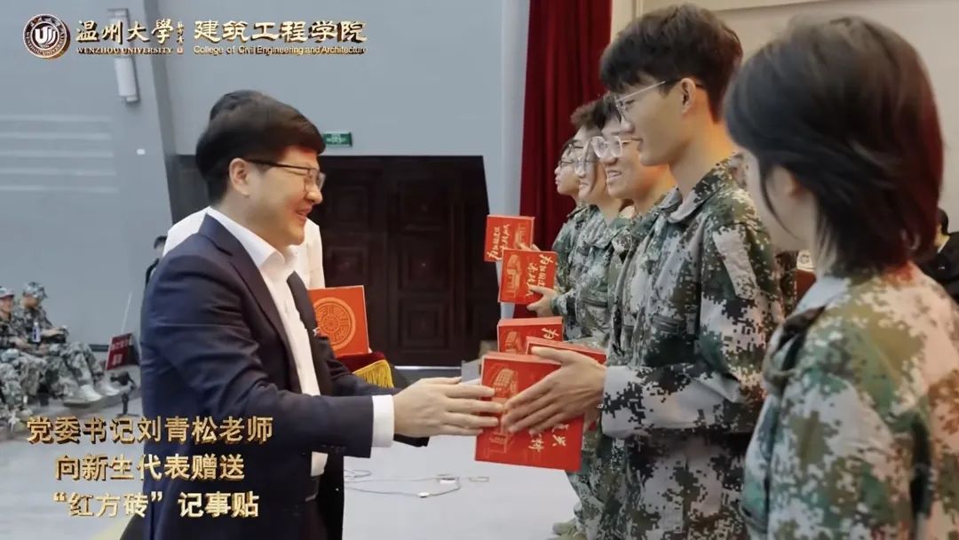 刘青松书记向新生代表赠送“红方砖”记事贴,寓意建工学子在未来老员工活里充实、无悔地码好专业人生的每一块“砖”,成就专业人生的高楼大厦,为民族复兴铺路架桥,为祖国建设添砖加瓦。