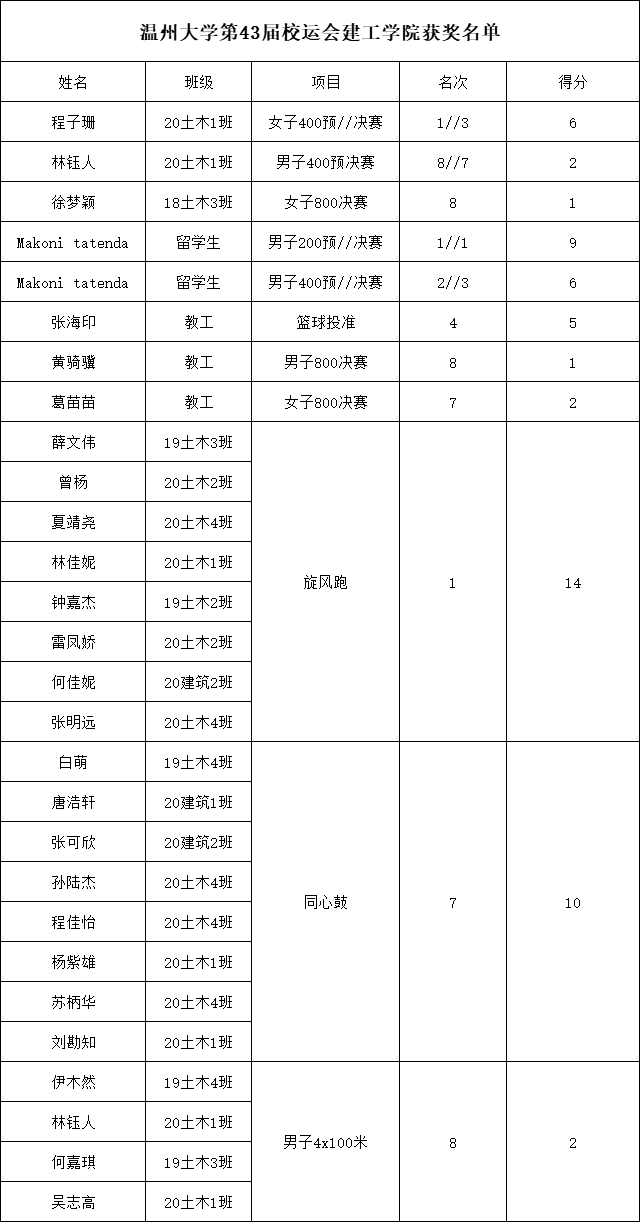 建工学子Makoni tatenda、程子珊分别在男子200米、男子400米、女子400米比赛中取得第一、第三的好成绩,公司集体项目旋风跑获得了冠军。