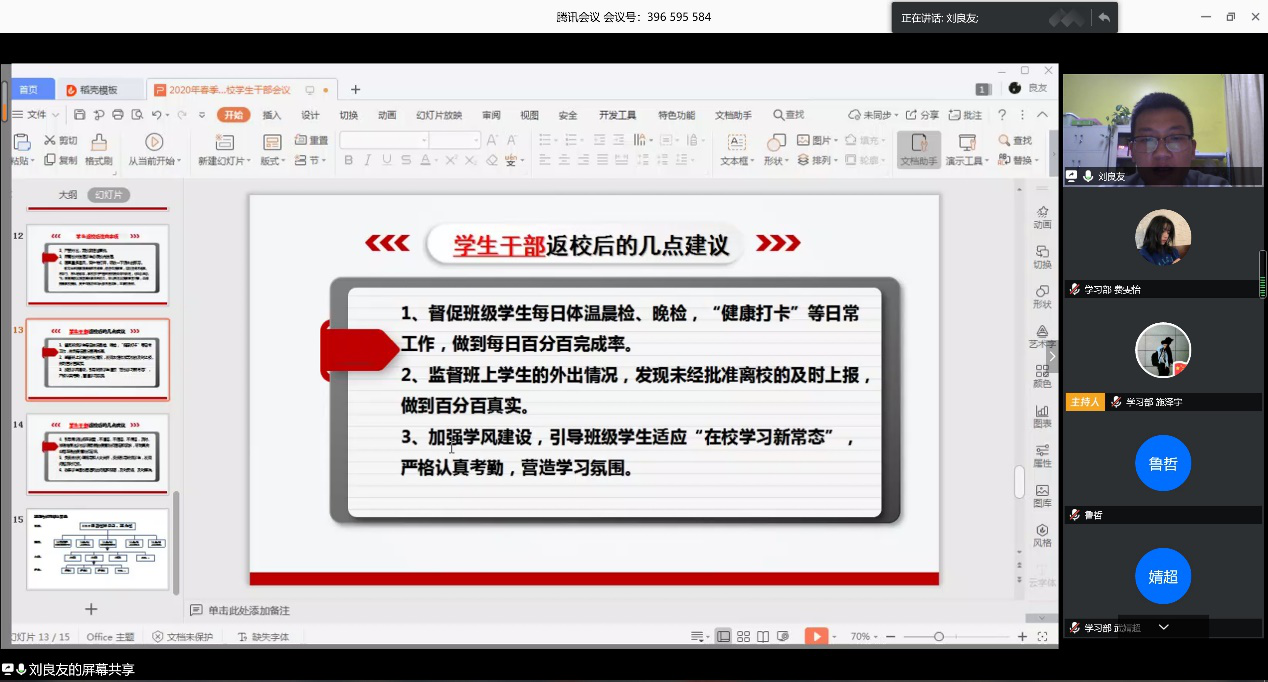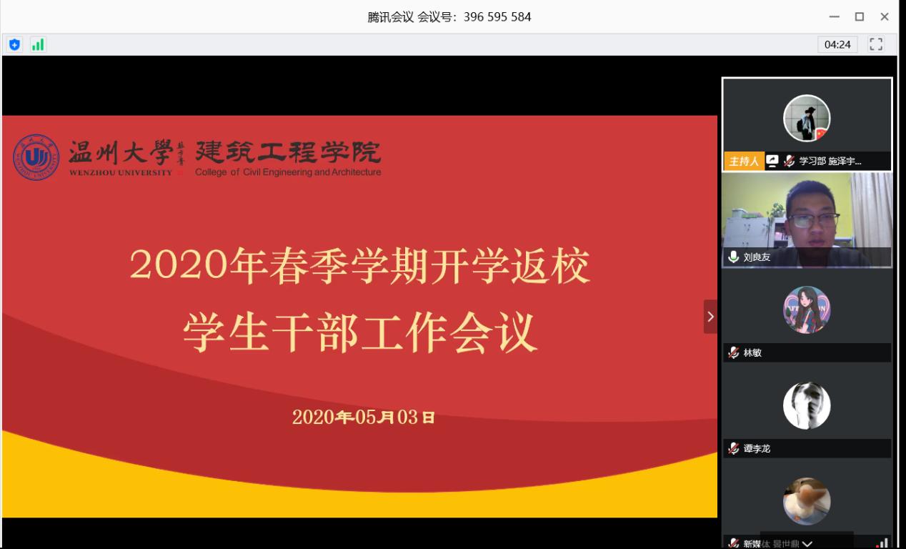 为新学期开学返校各项工作顺利开展,5月3日下午,公司通过线上平台召开了2020年春季学期工作会议。会议由建工团学学习部主办,建工团学指导老师、辅导员刘良友老师,团学全体成员以及全体班委出席了本次会议。