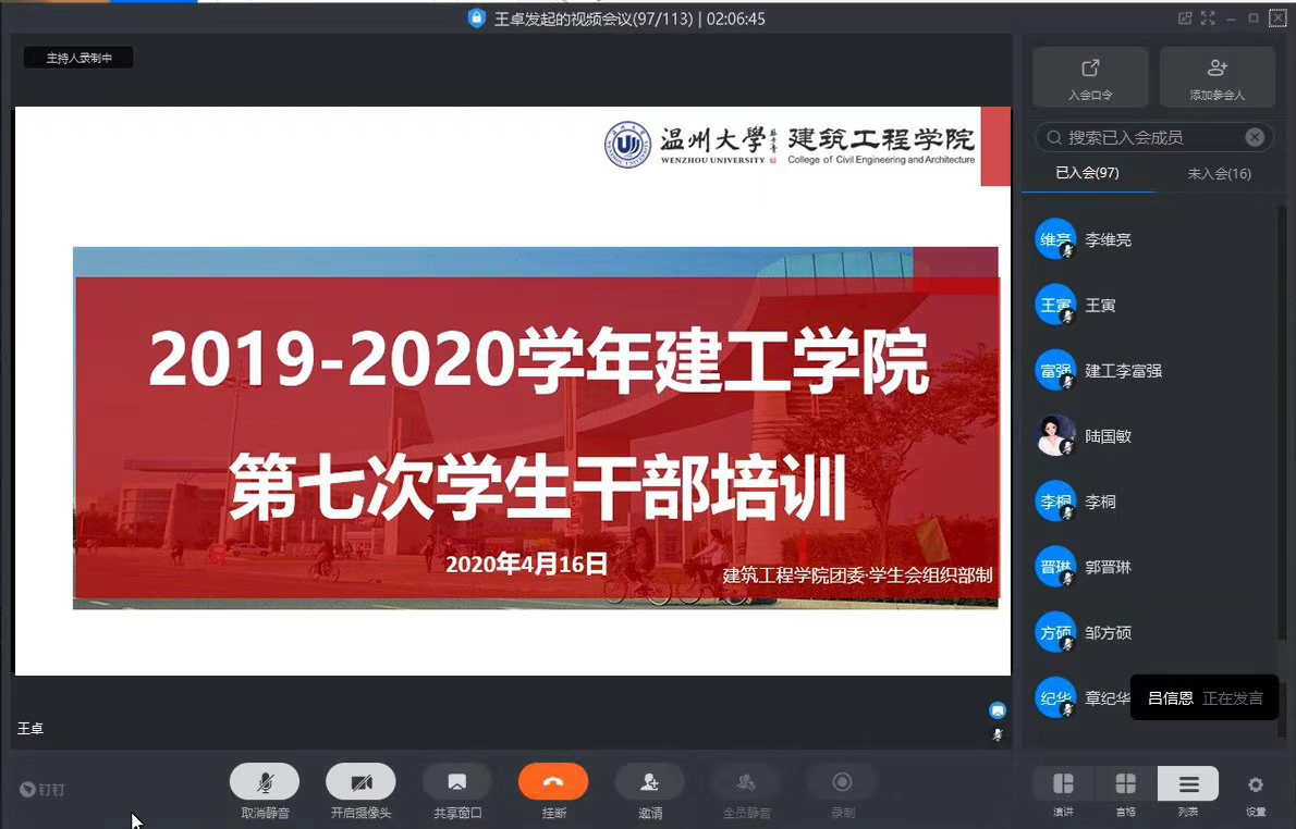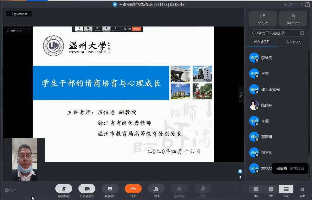 2020年4月16日,公司第七次员工干部培训“员工干部的情商培育与心理成长”在钉钉线上顺利开展。本次课程的主讲人为温州市教育局高等教育处副处长吕信恩老师。团委·员工会指导老师、辅导员刘良友老师担任本次培训课程的主持人,院研究生会、党员服务中心、团委·员工会全体成员及各班班委参加了本次课程。