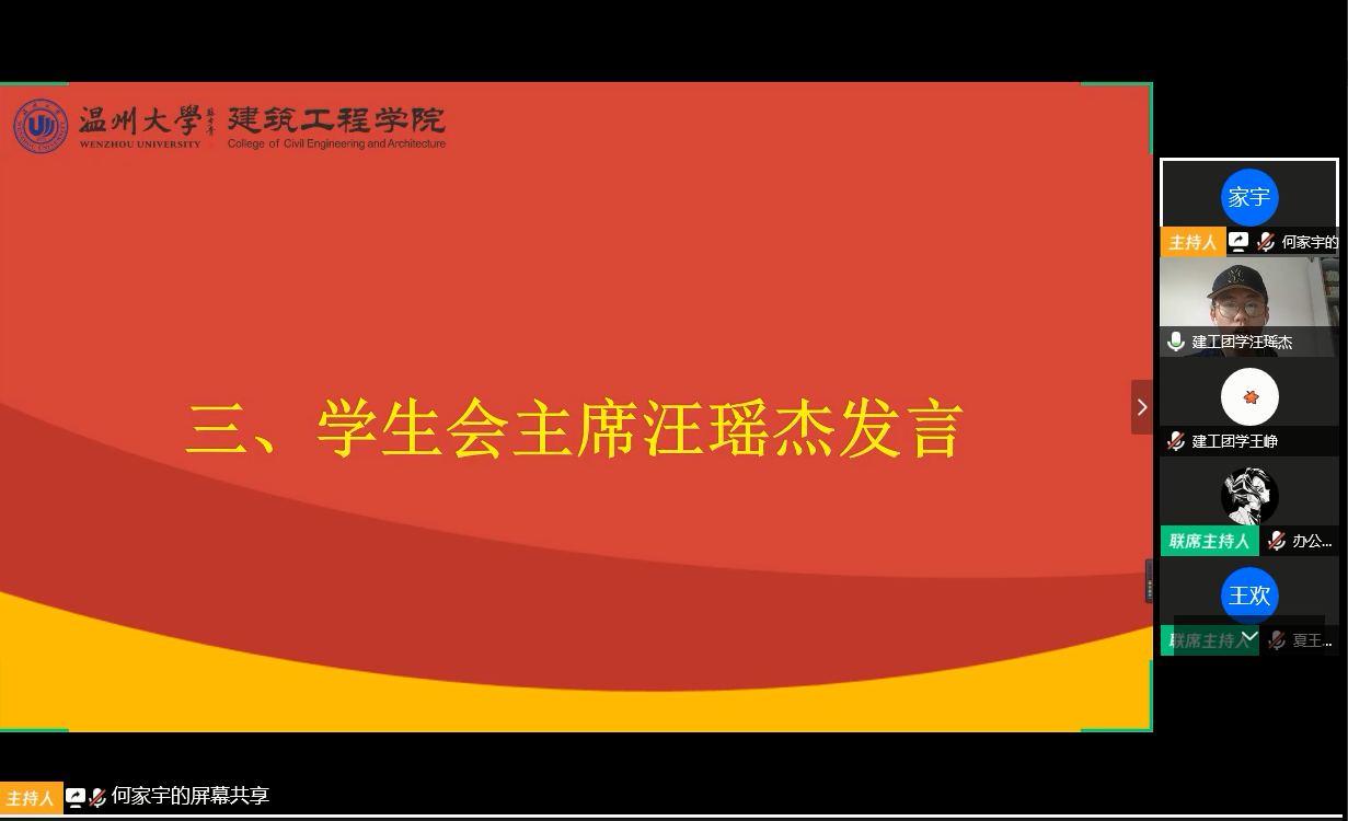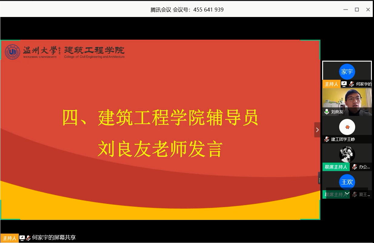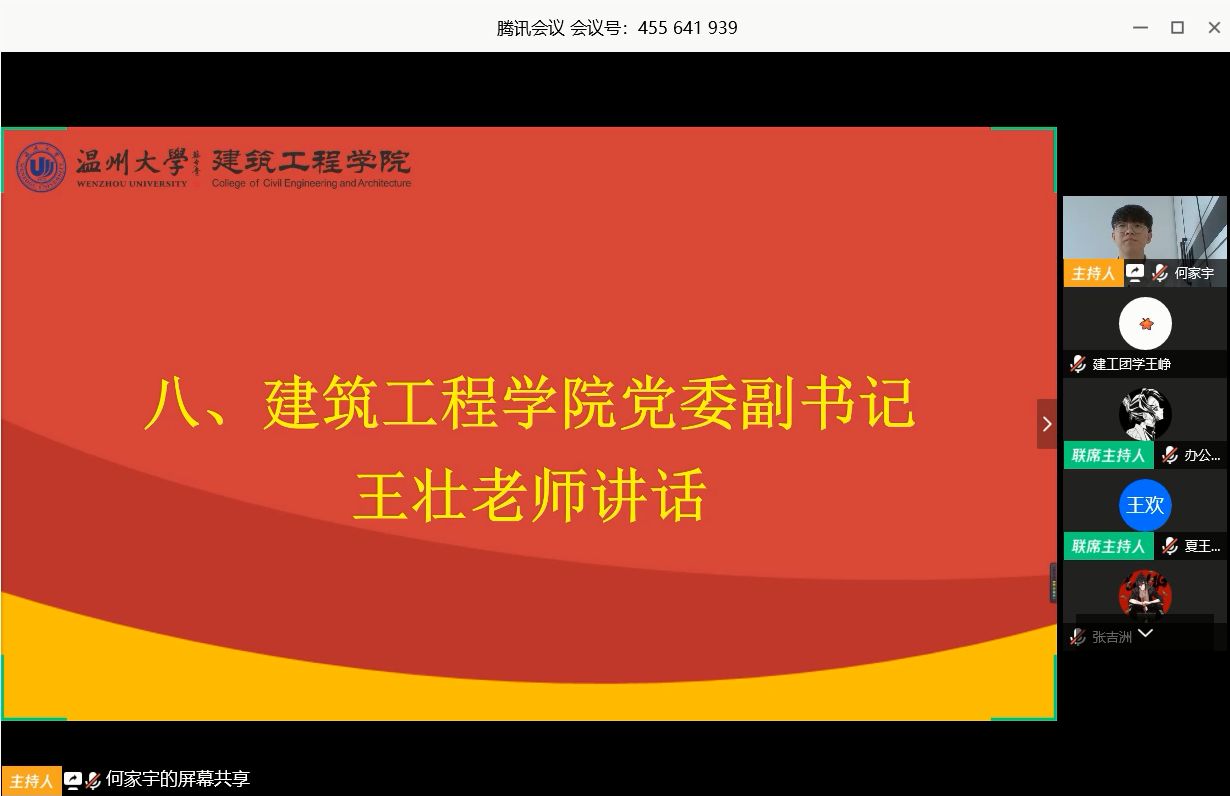 紧接着是员工座谈会,员工会成员和班委通过在线交流,对公司工作和团学工作进行深入探讨,提出了当前存在的问题和遇到的困惑等,老师和主席团成员一一进行了解答。最后王书记进行总结讲话。王壮老师对团学工作表示肯定,提出建工的同学们脸上要有自信,要宣传好公司和团学工作,人人都要当好宣传员,并对团学接下来的工作提出了进一步的要求与展望。