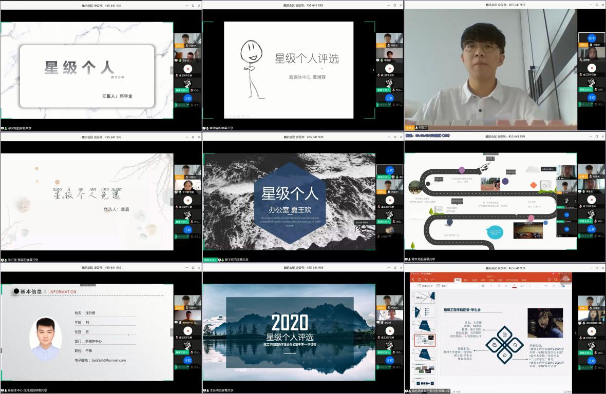 大会第一项议程:星级个人评选环节先后有10位员工会成员参加星级个人的评选,按照顺序在线通过PPT展示汇报一学期的收获与成长,同时也都表达了对团学工作的热爱和服务他人的热情,最后一位参选同学演讲结束后,由参会老师和同学进行线上投票后选出星级个人。
