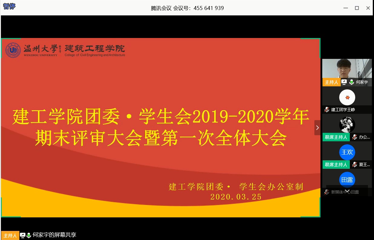 2020年3月25日下午,公司在线上开展了太阳集团tyc46332019-2020学年第一学期期末评审大会暨第一次全体大会。公司党委副书记王壮老师、团委书记潘莉莉老师、团学指导老师刘良友老师、丁佳洁老师、辅导员施光琼,团委·员工会全体成员以及18、19级各班班委参加本次会议,会议由办公室成员何家宇主持。