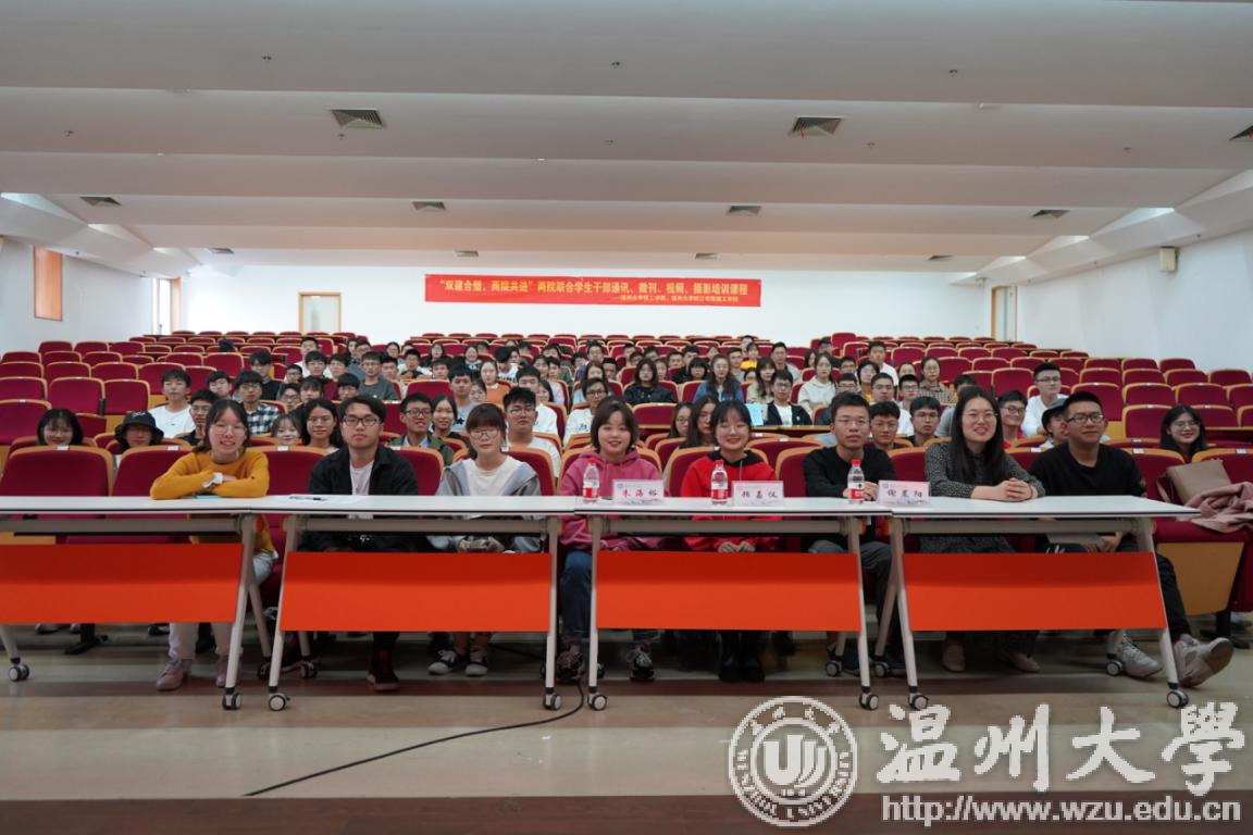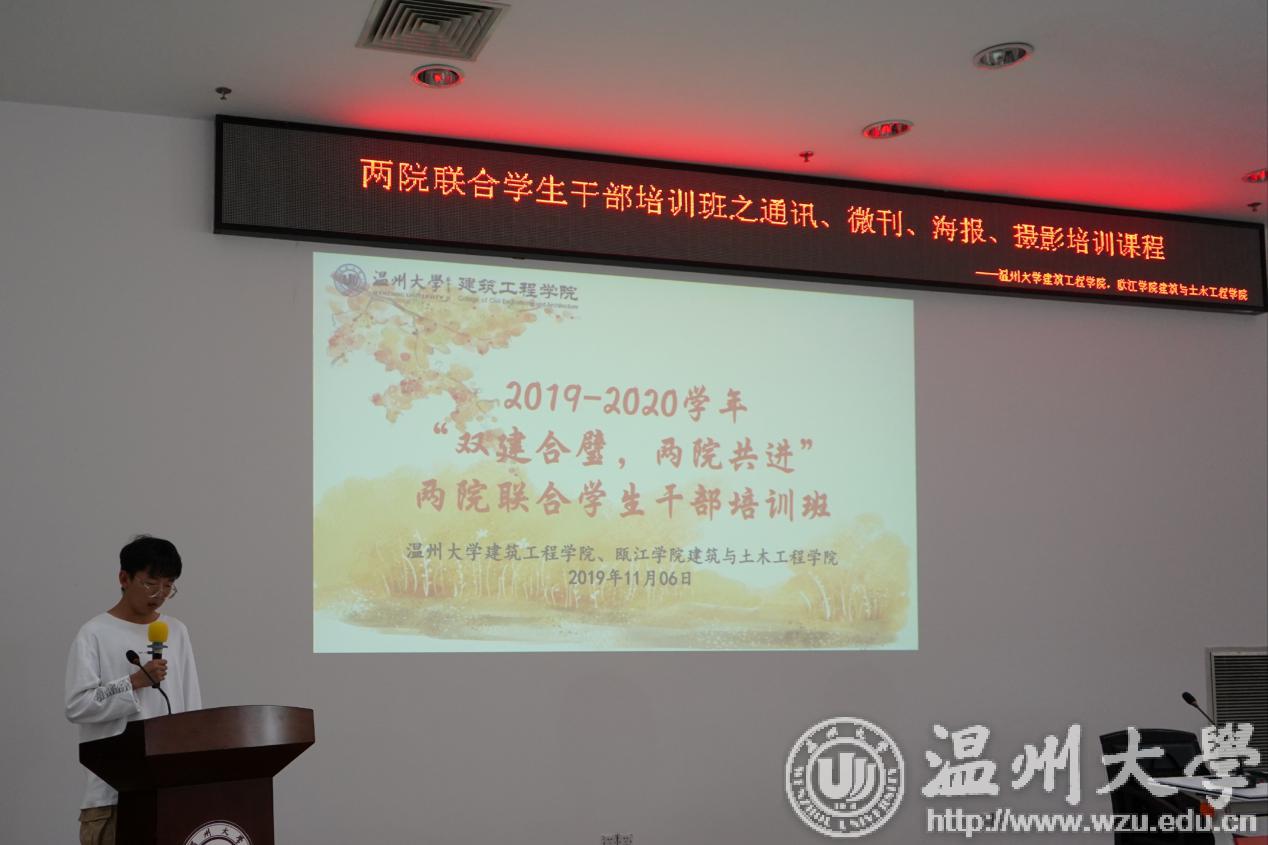 2019年11月6日下午14:00,为提升员工干部在工作上的专业素养,太阳集团tyc4633联合瓯江公司建筑与土木工程公司在南校岩松堂步青厅举办了一场以微刊、通讯以及摄影和海报为主题的讲座。本次培训讲座有幸邀请到了2019届建工团学编辑部部长顾嘉仪、记者团部长朱海裕和新宣部部长谢晨阳。