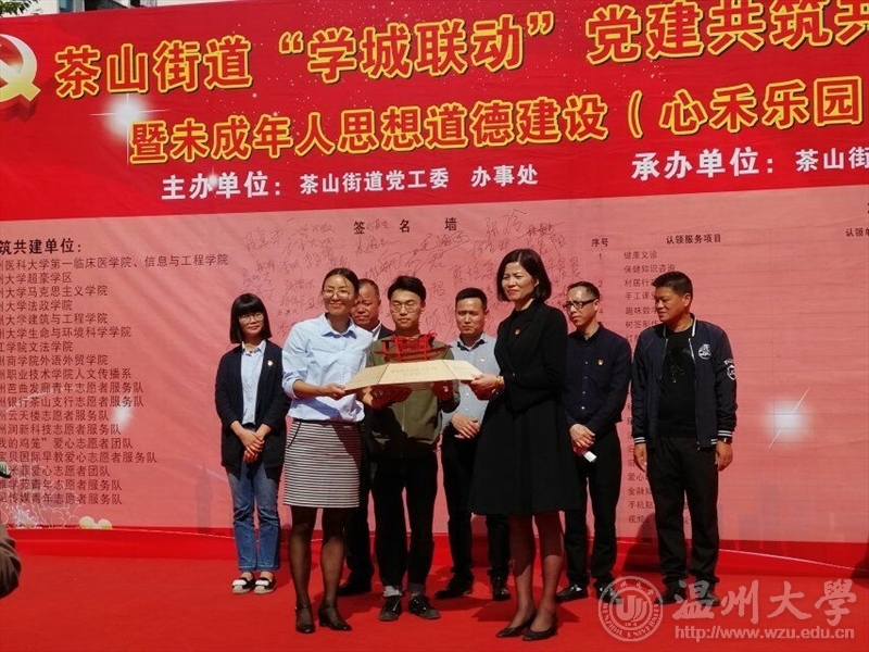 4月18日下午,太阳集团tyc4633“筑心”青协及志愿者和15建筑学团支部同学们在太阳集团tyc4633团委书记潘莉莉带领下,前往高教·博园社区参与了茶山街道主办的“学城联动”签约仪式暨未成年人思想道德建设(心禾乐园)项目启动仪式。
