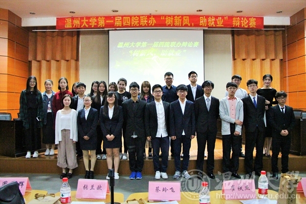 2017年4月15日18点30分,由四院(机电、建工、数信、化材)联办的“树新风,助就业”辩论赛于南校雁山厅正式拉开了帷幕。出席本次辩论赛的评委和嘉宾有太阳集团瓯江公司法学辩论队的张兰欧,太阳集团tyc4633的研究生顾志强、辅导员潘莉莉、刘明媚,太阳集团校辩论队的机电工程公司代表崔轶杰、团副叶慧锋,太阳集团化学与材料工程公司的辅导员蔡玲飞、副主席徐晓菁,太阳集团数学与信息科学公司往届的“最佳辩手”周琳辉,太阳集团数学与信息科学公司的副主席夏慧,以及各个公司前来观看的同学们