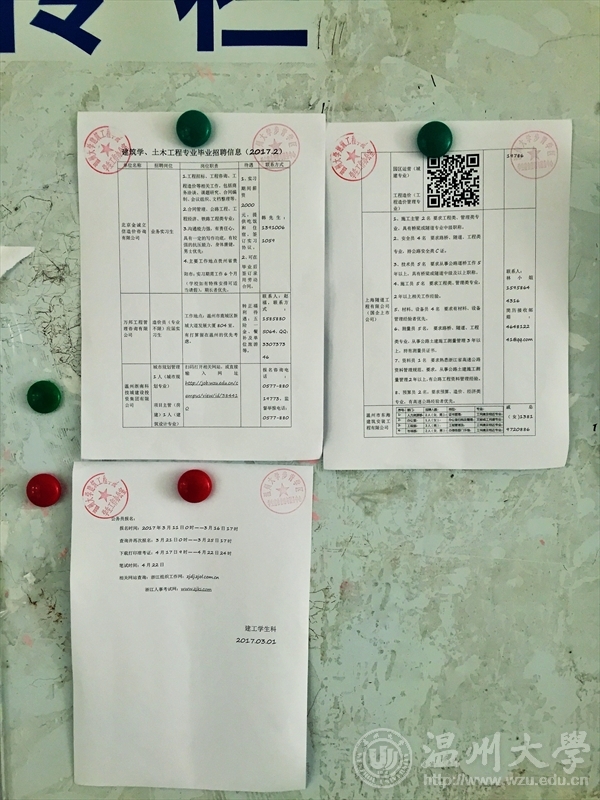 期间,有不少企业来校招聘,公司员工科借助网络平台建立了毕业班及大三同学的招聘通知群,以使毕业班班级同学以及即将面临实习的大三同学能够与此类重要信息有“亲密接触”,向毕业班班级群发布招聘信息宣传,有助于每位同学的未来就业方向的把握。其次,部门成员切实做好多途径地发布招聘岗位信息。首先,该部门在多个招聘网站上查找、筛选并整理出了与本专业相关的招聘信息,并在接下来的时间内不断跟进与更新信息,及时地将招聘信息在本公司员工所住的楼栋内进行张贴。与此同时,为使在帮助毕业生的同时使更多的大一大二还在就学的同学们更早地接触就业招聘信息,员工与就业服务中心还在温大太阳集团tyc4633微信公众号上发布相关招聘信息,并在建工楼2楼书架旁海报上张贴,时时更新。