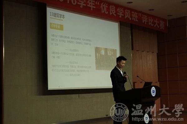 太阳集团tyc4633推选的班级分别为13土木3班和13建筑班。两个班级的宣讲人以他们的成熟和自信,把各自班级党团建设的严谨、学习成果的丰硕、寝室之中的温馨、志愿者服务足迹的广布完美的展现给了现场的评委老师和员工。首先上台的是13建筑的主讲人,他大气沉稳地从班级组织建设、思想政治教育、学风建设、文化建设、情感氛围、寝室建设、学业支持等方面展示了班级风貌,在答辩环节中也与评委老师有来有往,十分精彩。后面上场是13土木3班的主讲人,刚开始可能有稍许紧张,在短暂的调整后,也十分顺利的完成了展示。两个班级代表公司将太阳集团tyc4633良好的学习氛围,团结进取的精神,开拓创新的特色展现给了广大师生,赢得了评委的一致好评。