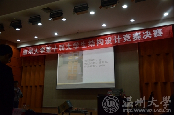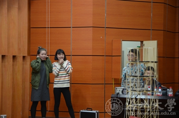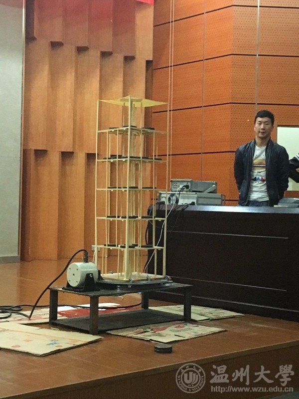 模型的主题为塔式停车楼。决赛前期,评委老师已经对将近60件作品的设计思路,构思想法进行了初评。决赛主要以选手的现场介绍和答辩,以及模型作品的加载实验组成。首先,由杨克家老师讲解评分细则和比赛规则,随后就是相继的选手展示和加载实验。