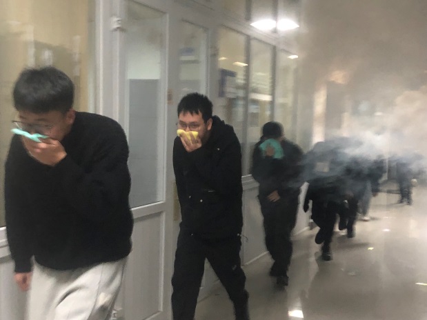 14:00演练准时开始。7号楼B209实验室冒出浓烟,实验室老师发现火情,立即带领员工用湿毛巾捂住口鼻,弯着腰,迅速有序地从B幢西侧楼梯跑出,并把发生火灾及疏散的情况报告给郭林副经理,郭林副经理再报告公司应急工作领导小组总指挥刘青松书记。同时,7号楼1、3、4、5层的员工也在老师的带领下从西侧楼梯撤出,通过模拟逃生体验屋,到达避险区域。
